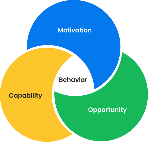 The COM-B model ensures our platform addresses Capability, Opportunity, and Motivation, creating a comprehensive approach to behavior change and engagement.